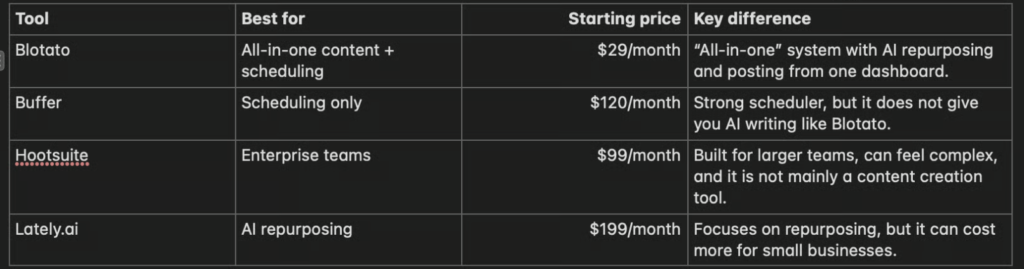 Blotato can replace parts of a typical content tool stack. For many users, it reduces the need for tools like ChatGPT for writing, Buffer or Hootsuite for scheduling, Canva for simple content assets, and manual repurposing workflows. You may still keep other tools if you need advanced design or editing features.