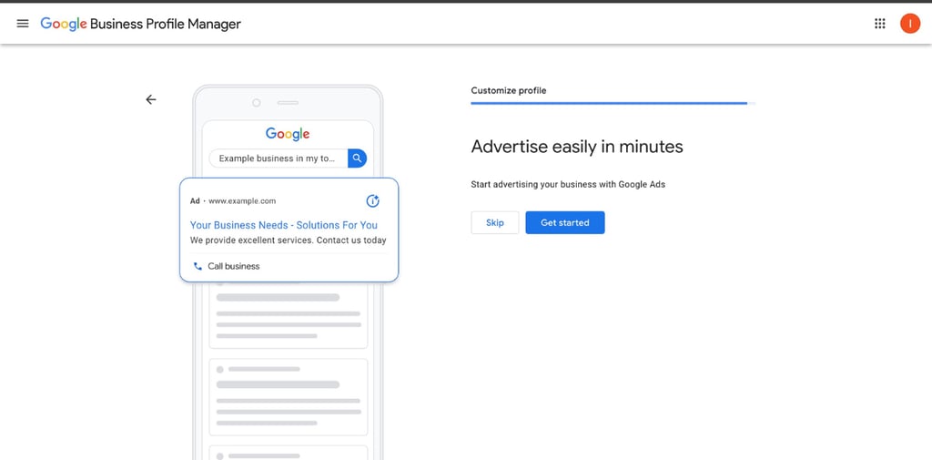 Now finally it will ask you if you want to use ads for your business for now click Skip and final window will appear click continue.