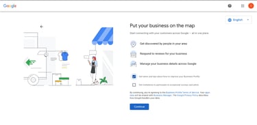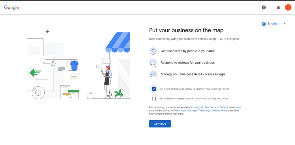 This page ask you if you want receive news and tips to improve your business profile and and get invitation to participate in occasional surveys and pilots. its up to you if you want to enable these or not and after selecting click continue.